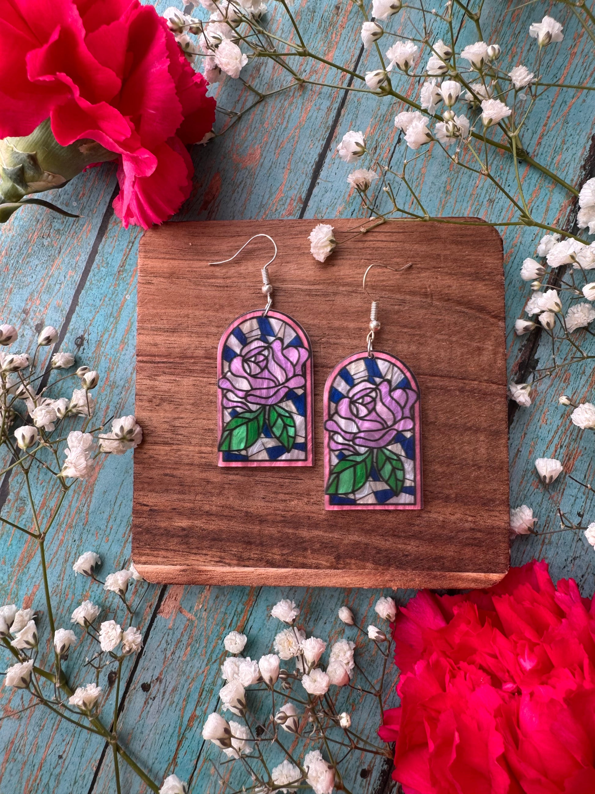 These pretty purple rose acrylic earrings resemble beautiful stained glass windows.