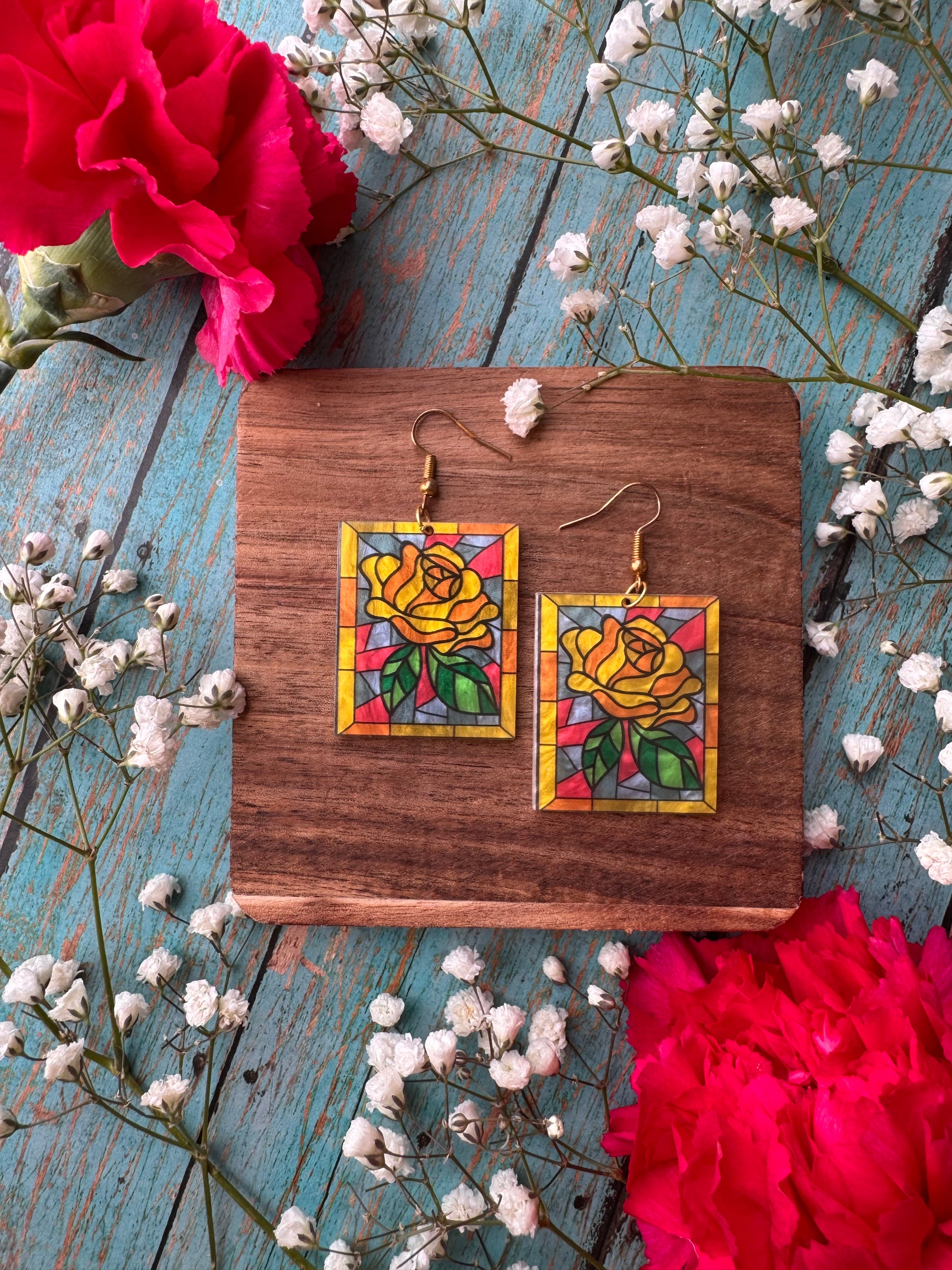 These pretty yellow rose acrylic earrings resemble beautiful stained glass windows.